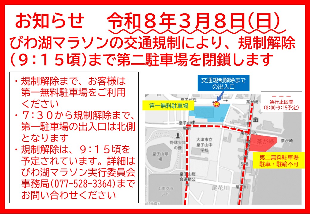 3月8日(日)の「びわこヴィーナス!第6回酒処京都新京極スタンド杯」最終日において、びわ湖マラソン2026の開催に伴う交通規制により、規制解除(9:15頃)まで第二無料駐車場を閉鎖いたします。 交通規制中の駐車は、第一無料駐車場をご利用くださいますようお願い申し上げます。