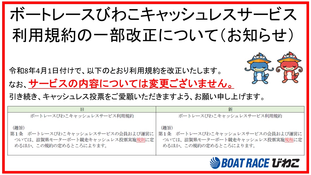 令和8年4月1日付けで、ボートレースびわこキャッシュレスサービス利用規約を以下のとおり改正しますので、お知らせします。 なお、サービスの内容については変更ございません。 引き続き、キャッシュレス投票をご愛顧いただきますよう、お願い申し上げます。